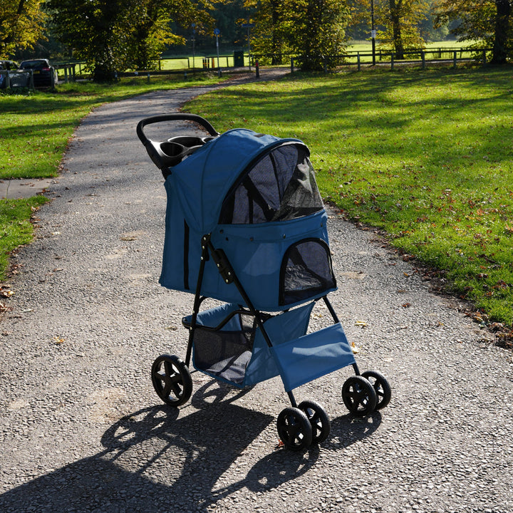 Manoeuvring is a breeze with the stroller’s 2 x 8" rear wheels and 4 x 6" front swivel wheels, offering a smooth and stable ride, even on rough terrain. The foam-covered handle adds extra comfort, so you can enjoy a pleasant, controlled stroll. Plus, the stroller includes a generously sized basket and a cup holder, giving you space for all your essentials—treats, toys, water bottles, and personal items.